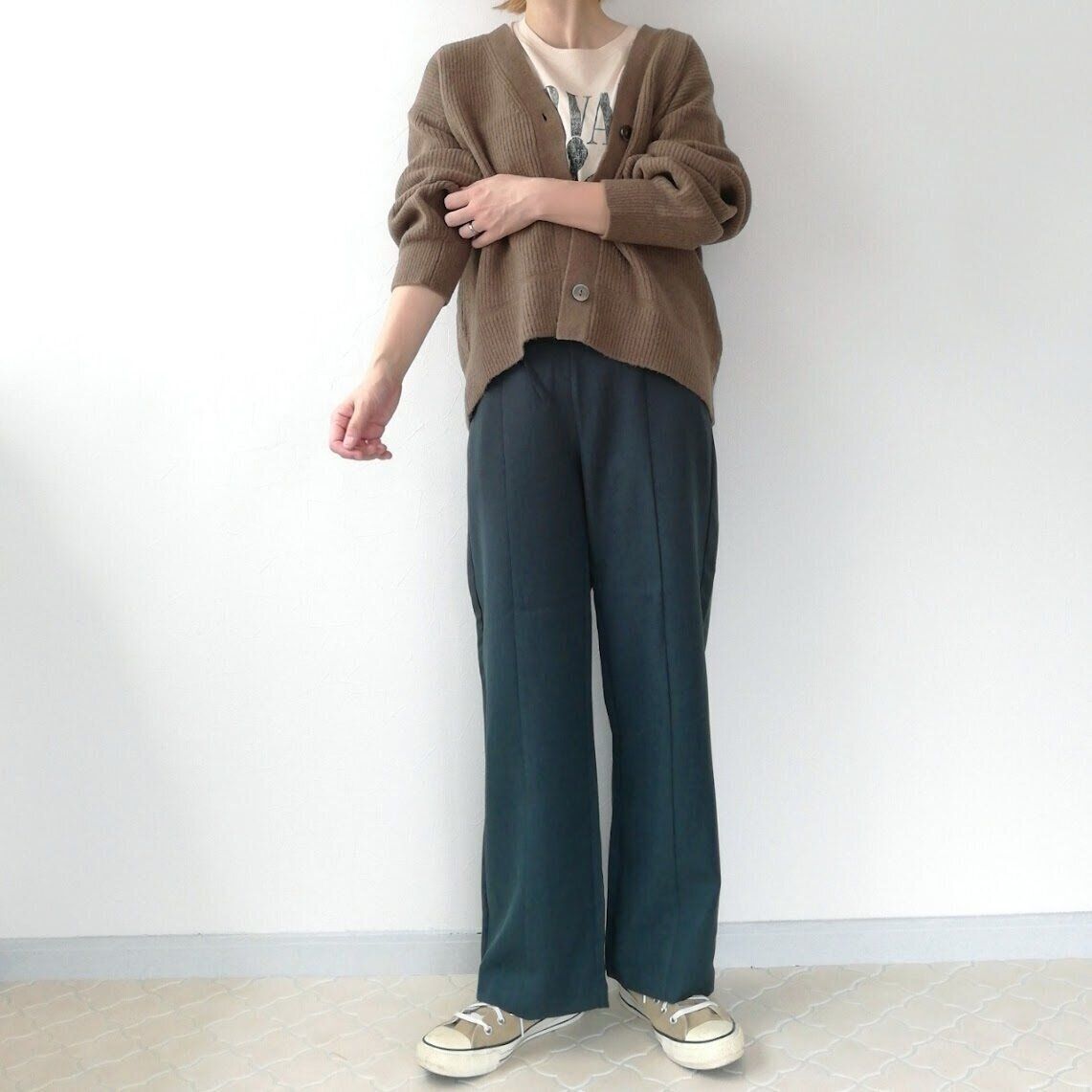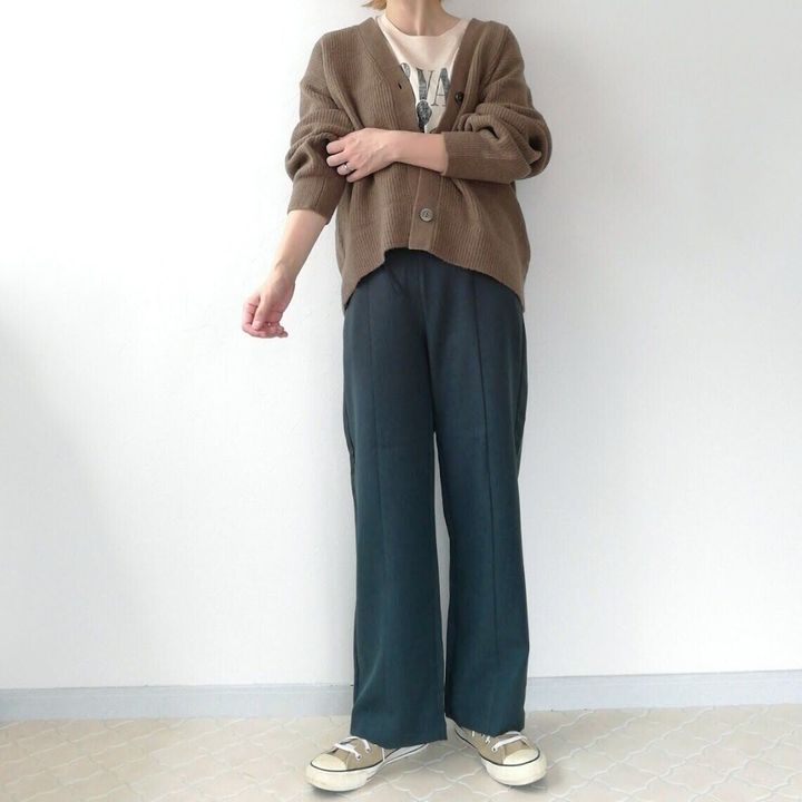 ゆるカーディガン×スニーカーの大人カジュアルなコーディネート。