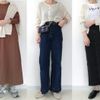 さらりと落ち感のある素材と、ウエストゴム仕様で楽な着心地がうれしい1枚。センターシームできちんと感を演出できるのもうれしいポイント。細すぎず太すぎないセミワイドシルエットで、脚をまっすぐきれいに見せてくれます。