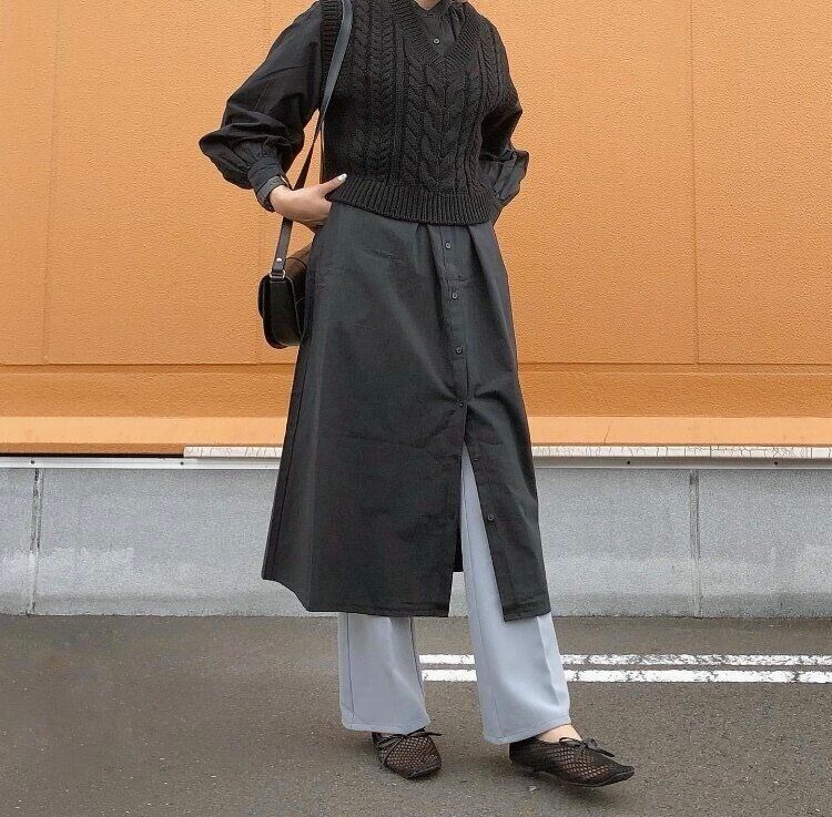シャツワンピースに「2WAYストレッチフレアパンツ」をあわせれば、格上のワンピースコーディネートが完成します。