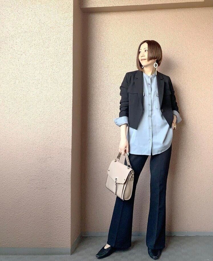 ハンサムコーディネート好きの人にはとくにおすすめの「2WAYストレッチフレアパンツ」。ジャケットとあわせればクールなマニッシュコーディネートが完成します。