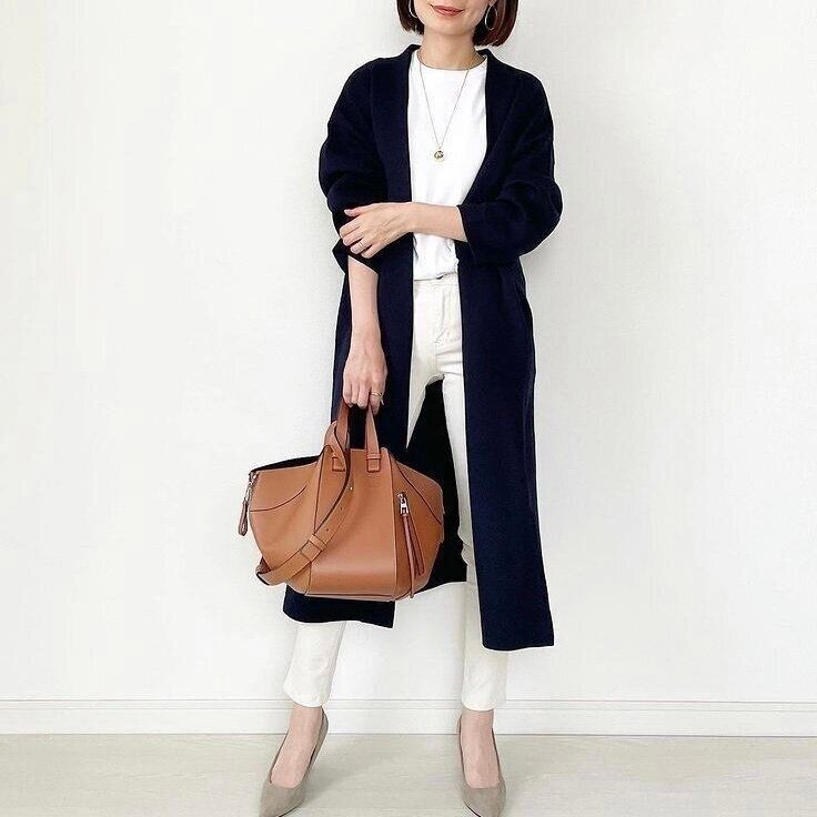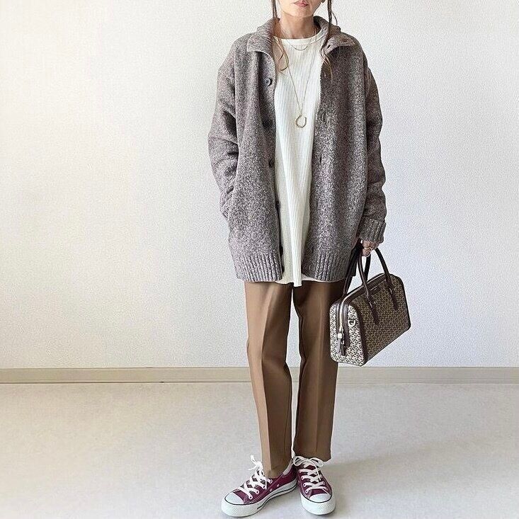 外出する前に、少し寒さを感じたら、パパッと手に取りやすいのが、GUの「ニットロングガウン」(2,990円)。シンプルでシーンを選ばず羽織れるライトアウターとして、毎年人気が高いアイテムです。これがあれば、スカートでもパンツスタイルでも万能。ロング丈なので、着るだけで自然とシュッと見えるのも魅力です。