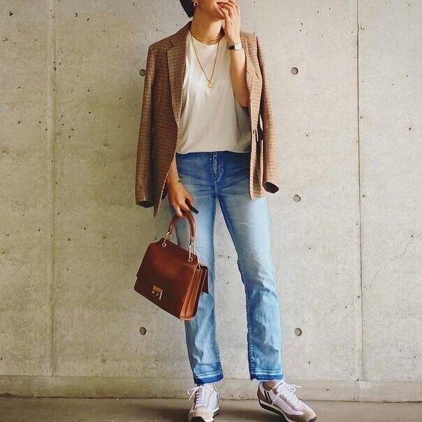 「リラックステーラードジャケット」(5,990円)は、デニムコーデをキリリと見せたいシーンで大活躍!ゆったりとしたシルエットなので、デニムと合わせてもチグハグ感なく着こなせます。細かいチェックも合わせやすく秋気分も高めてくれて◎。