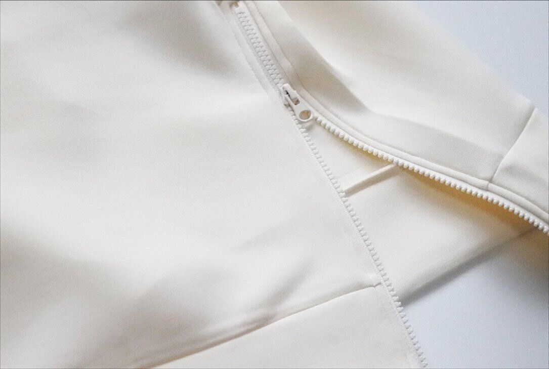 このトップスのポイントは片脇についているファスナー。こちらを開けるとアシンメトリーになり、いろいろな表情を楽しめます。