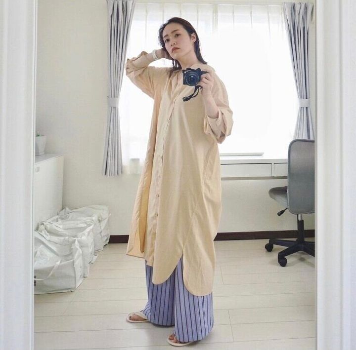 今回はInstagramで見つけた「コットンギャザーロングシャツワンピース」のお手本コーディネートをご紹介します。