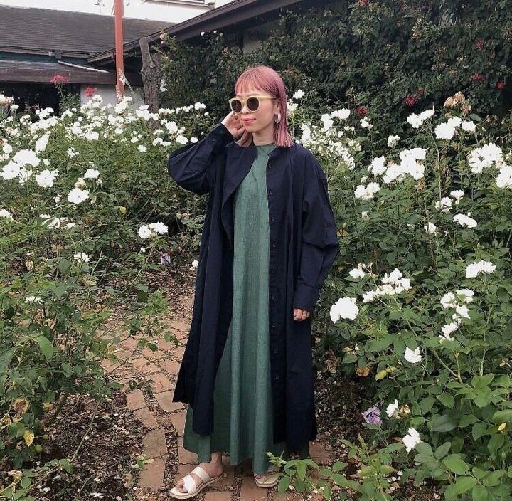 「コットンギャザーロングシャツワンピース」をアウター代わりにワンピースと組みあわせたワンピース×ワンピースの上級者コーディネート。