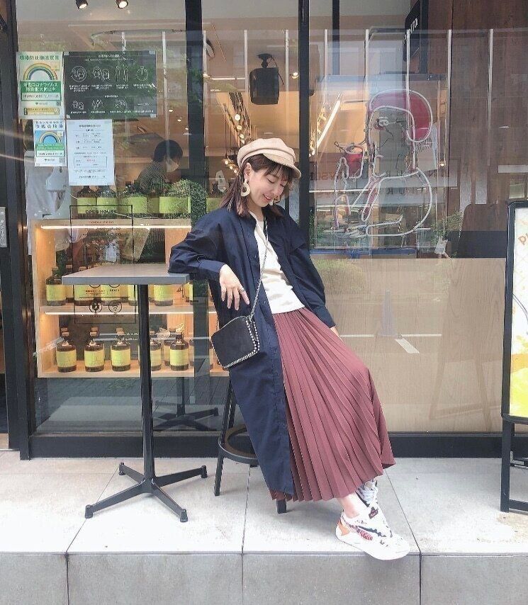 ワンピースの丈感とプリーツスカートの丈感をあわせたコーディネートは、縦長のシルエットをより強調してくれるのでかわいいだけではなく着やせ効果も期待できるイチオシのコーディネート!