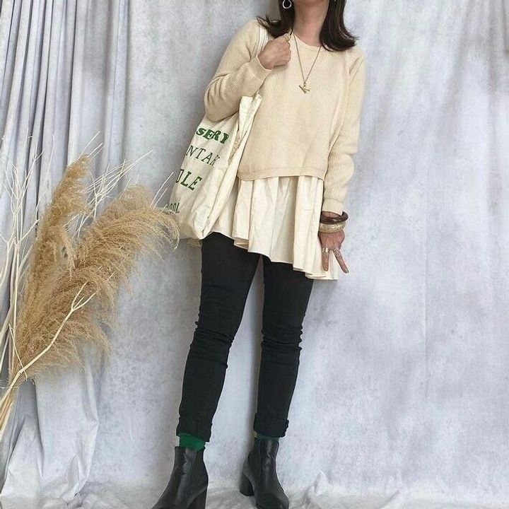 こちらは、楽天などで購入できるプチプラブランドreca(レカ)の「アンバランスフレアヘムニット」。袖周りにボリュームがあるデザインなので、ウエストやヒップラインをさり気なくカバー。切り替え位置がウエストより高い位置にあるので、自然と腰位置を高く見せてくれます。