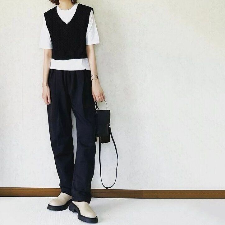 スタイリッシュなムードを後押しするモノトーンコーデ。しまむらのニットベストを投入すれば、今年らしさもアップします。コンパクトな着丈で太めの黒パンツともバランスがとりやすく、お手持ちのスタイリングにマッチ!