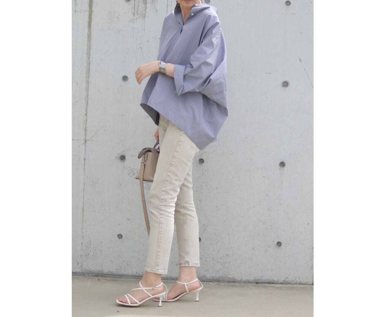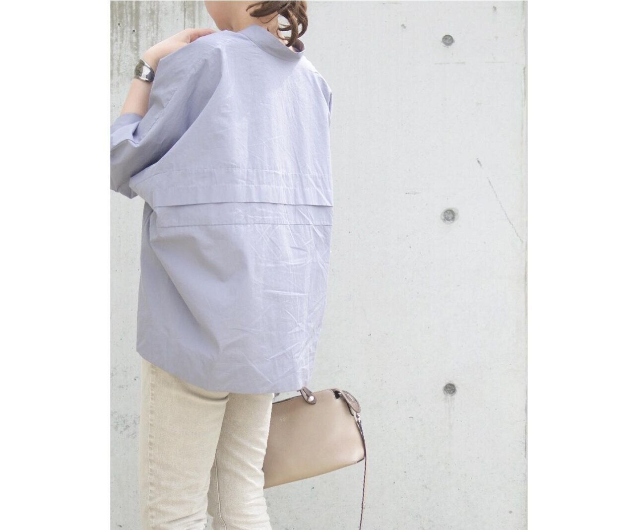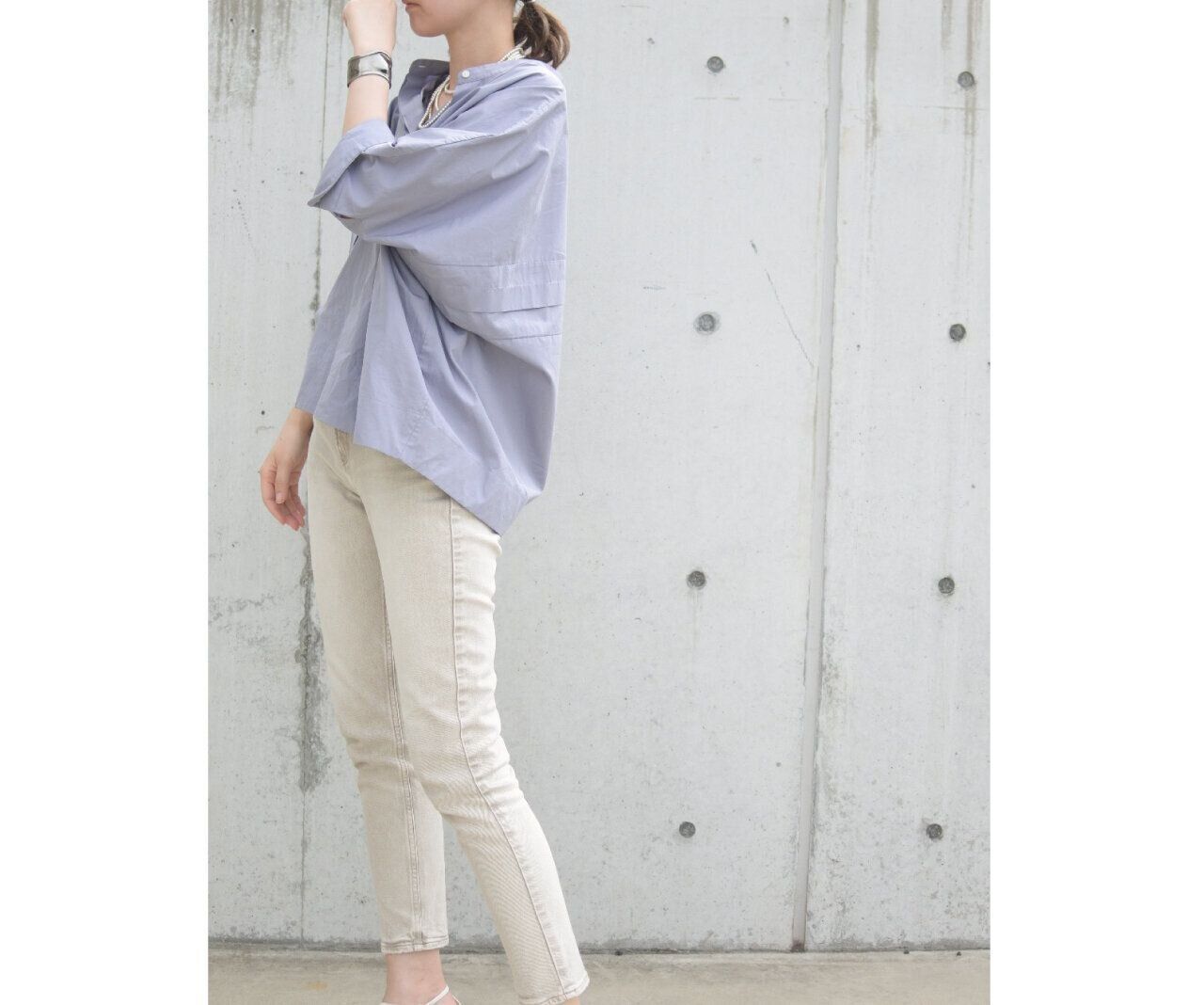 私は丸顔でバンドカラーの上までボタンを閉じると目立ちやすいので、2つほど開けて後ろ側に衿を抜いて着ています。シャツの固いイメージが柔らかくなりますよ。