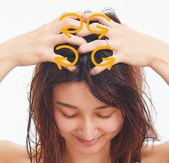 血液を流すイメージで、小さく「の」の字を書きながら生え際から頭頂部へとゆっくりと押し上げる。