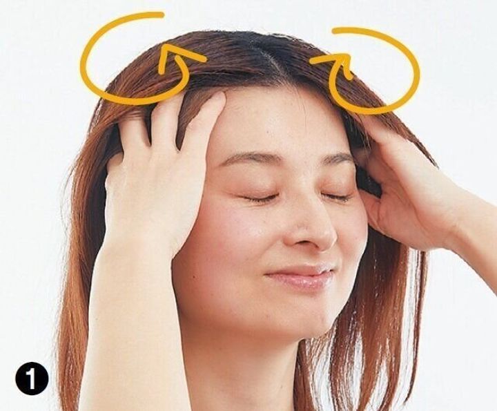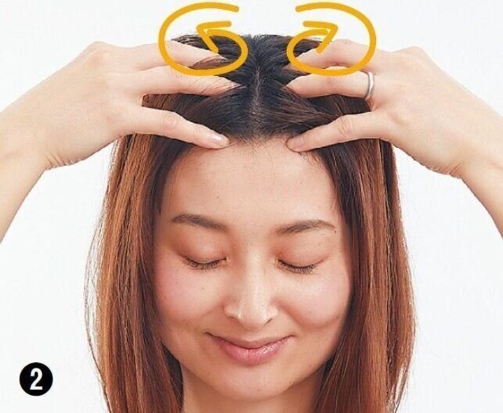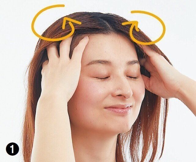両手の指を広げて側頭部の地肌に当てる。こすらず、その場で頭皮を動かすように「の」の字にもむ。頭頂部へ向かって少しずつ指をずらしながらもむ。
