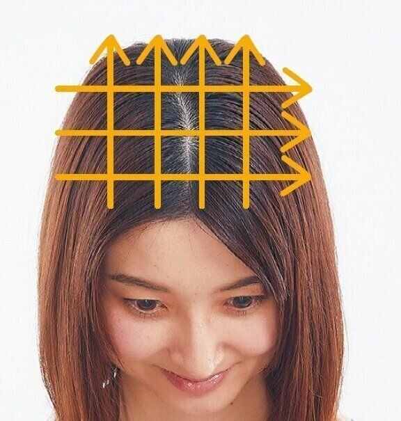 縦4本、横3本ほど線を引くイメージで、血流が滞りやすい頭頂部を中心に塗布。こめかみ付近など、白髪や薄毛が気になる部分にもつけるとよい。