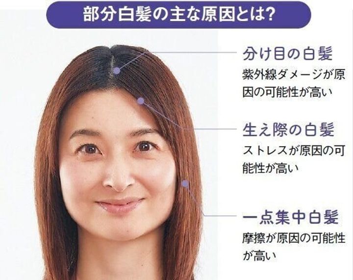 白髪の原因は、遺伝、加齢、生活環境、ストレスなどが考えられています(髙瀬先生)、一部分だけに集中して生える白髪は、外的要因が影響していることが多いため、下記の原因を取り除くことで改善する可能性大。(田村さん)