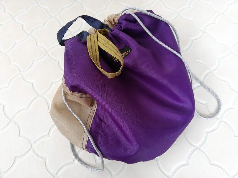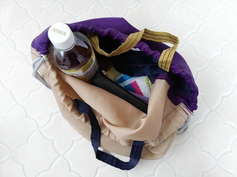中身によって形が変わる巾着バッグ。ぼこっとした形になるのは避けられない……!