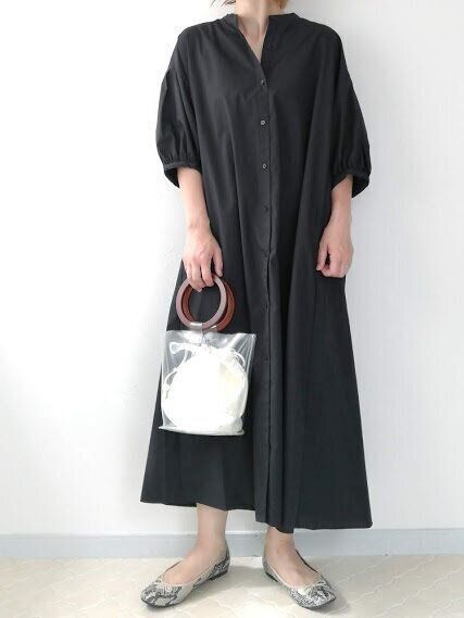 ふんわりしたお袖が可愛い、トレンドのバンドカラーワンピース。