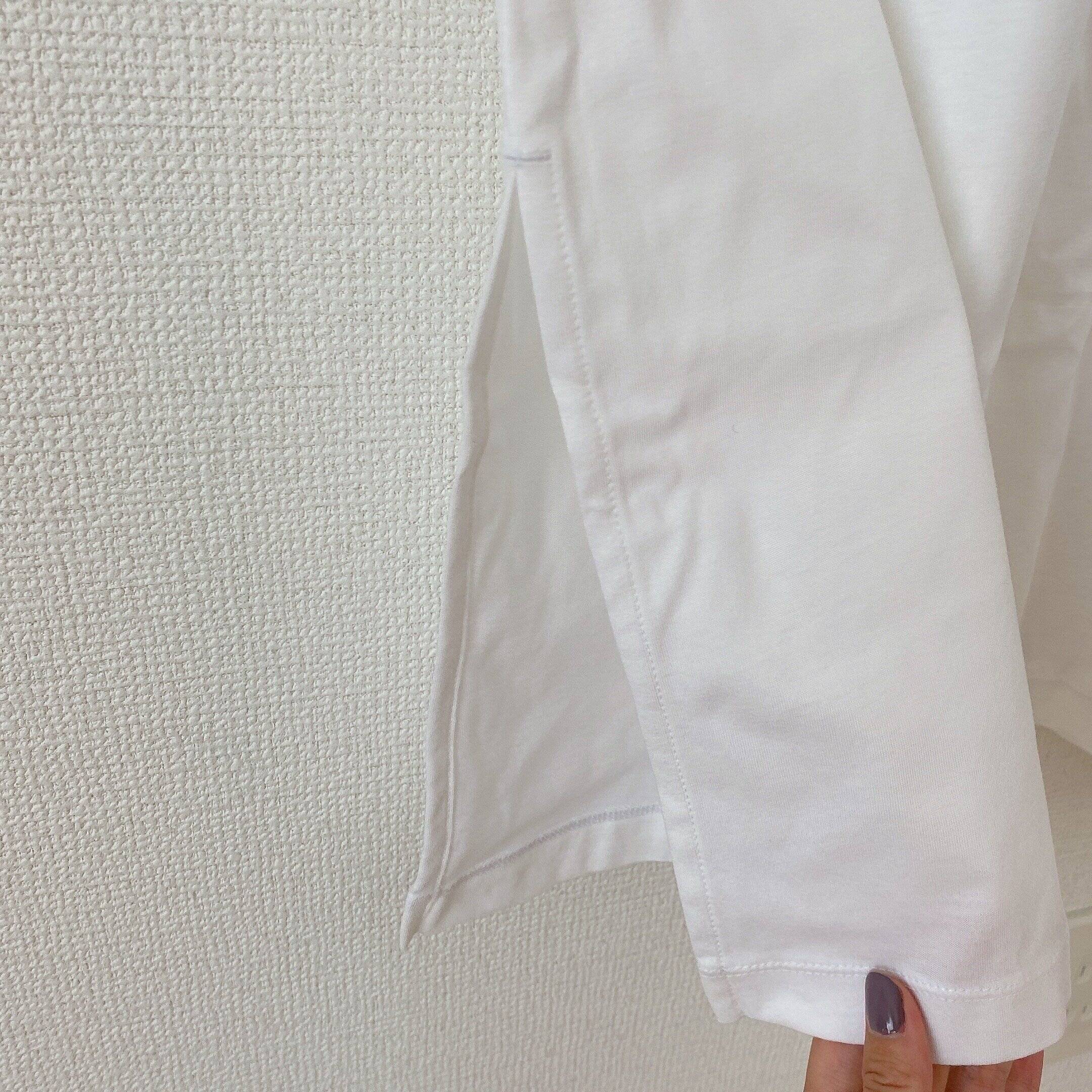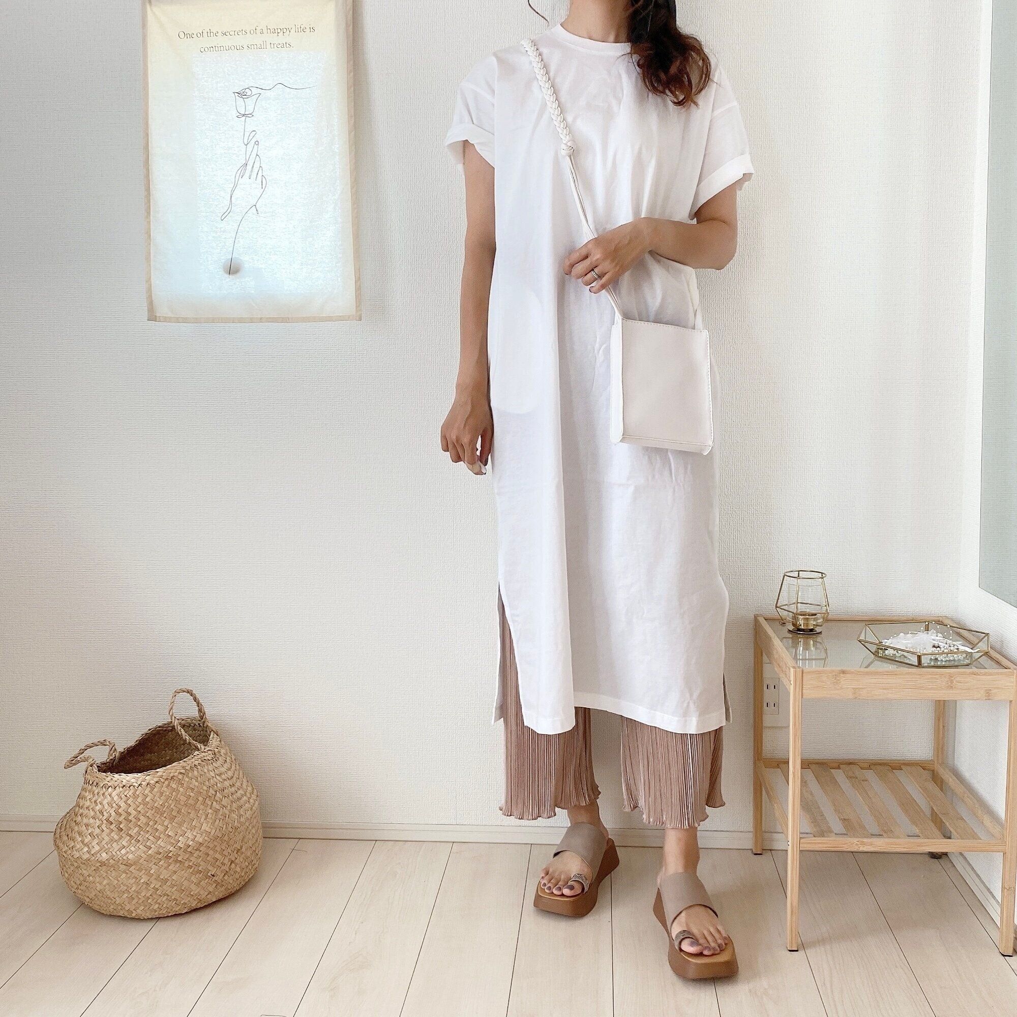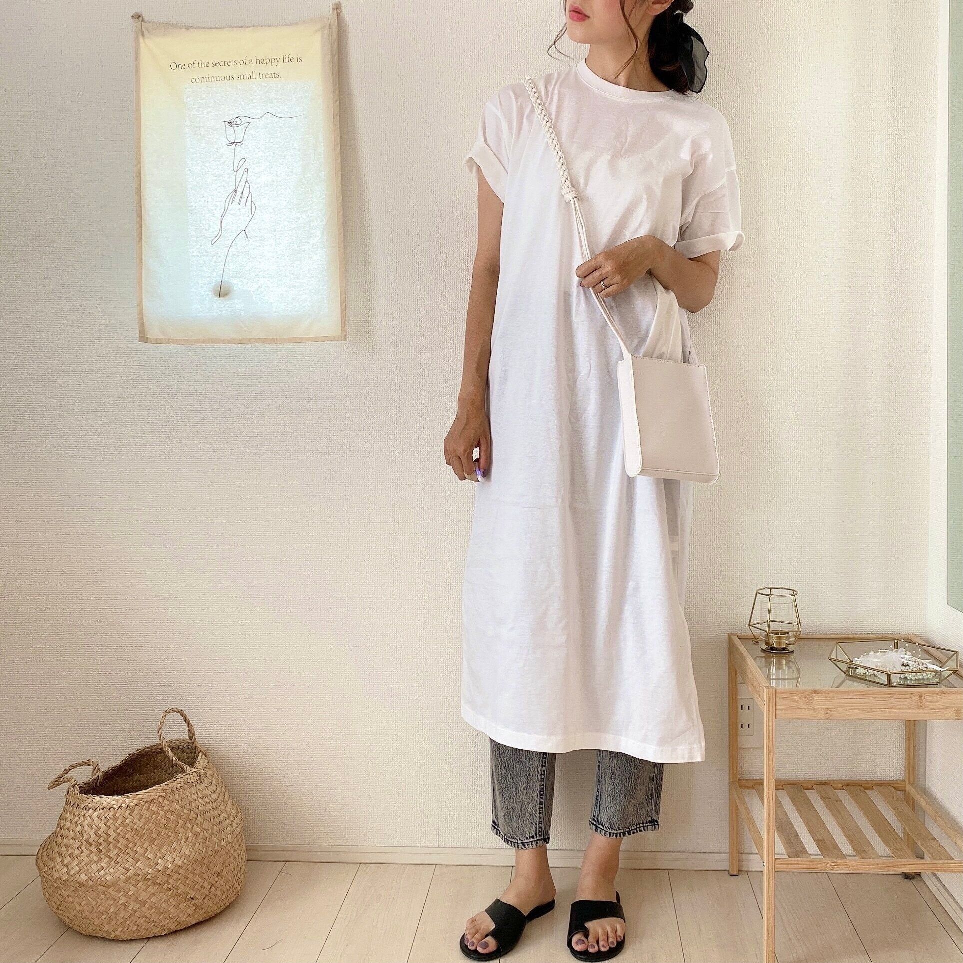 高身長の筆者が着てもひざが隠れる丈と、袖もやや長めなので気になる二の腕も隠せます♡ホワイトはやや透け感があるのでインナーに注意ですが、1枚でさらっと着てもちょっと光沢感のあるマーセライズ生地なのでサマになります!