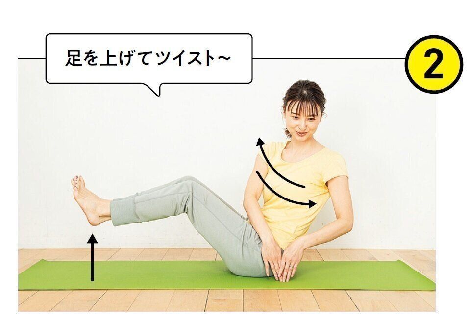 体をひねるとき、息を吐ききってお腹の奥をギュッとつぶすようにすると、より効果的。お尻が浮かないように気をつけて!