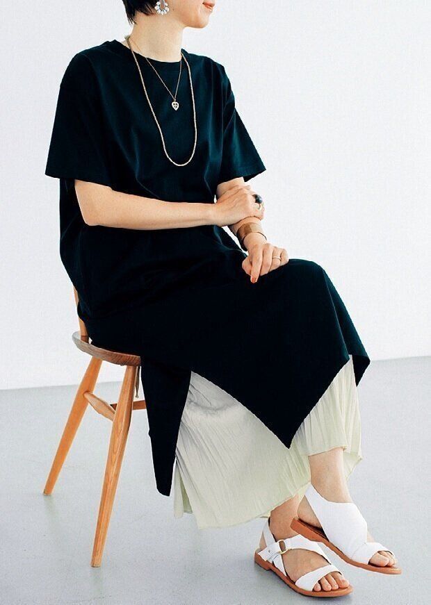 「大人は特に形に気をつけて。単純な"T"の形ではなく、トレンドのビッグシルエットやフレンチスリーブなど、デザイン性が高い物を選びましょう。このTシャツワンピは光沢感のある素材も好印象だし、すそにスリットが入っているから、重ね着しても軽やか。まさに40代に似合うTシャツと言えますね!」。