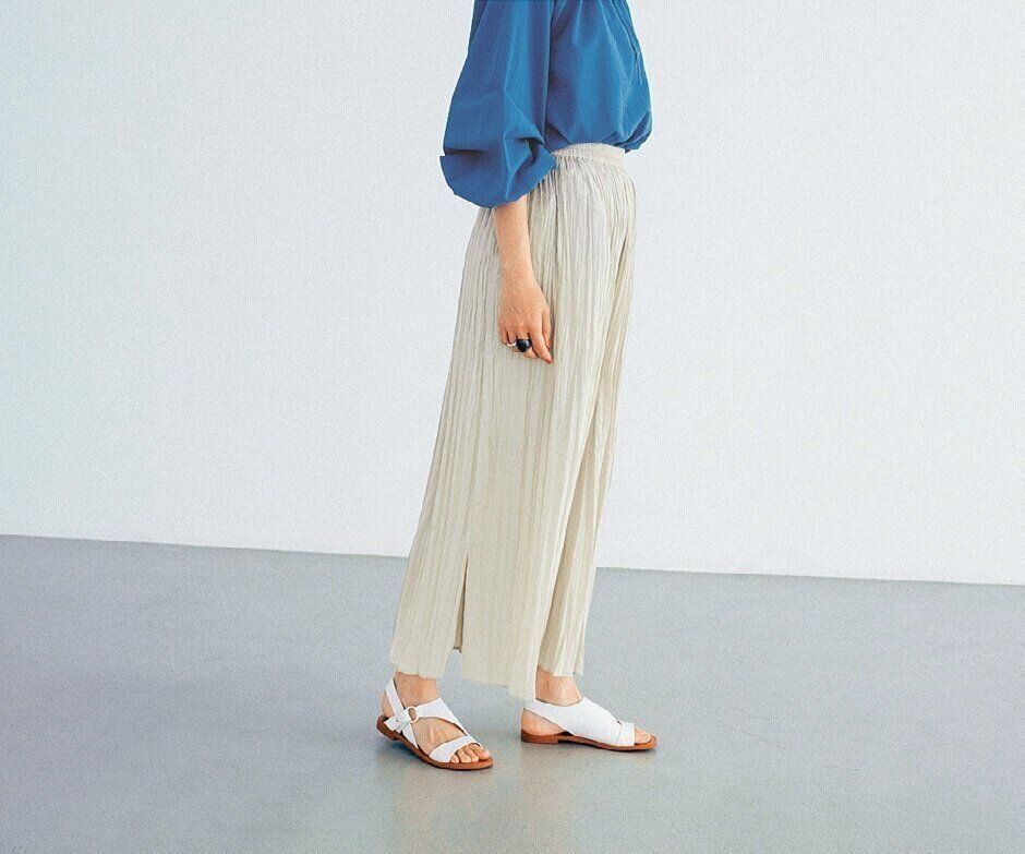 「ワッシャーサテンスカートパンツ」(ナチュラル、ライトオレンジ、ブルー、ブラック・全4色)¥2,990(税込み)/ユニクロ、「ボリュームスリーブブラウス(長袖)」(ブルー、オフホワイト、ネイビー・全3色)¥2,990(税込み)/UNIQLO and JW ANDERSON/ユニクロ そのほか本人私物