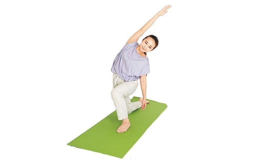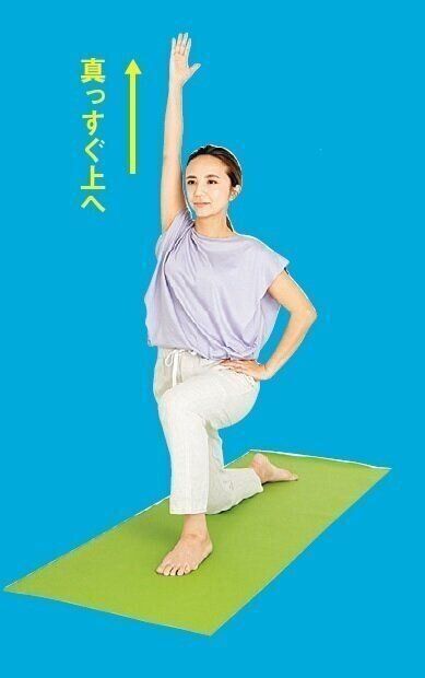 左足を前に出し、床に右ひざをついて、片ひざ立ちになる。左手は腰に当て、右手を耳の横に上げて伸ばす。