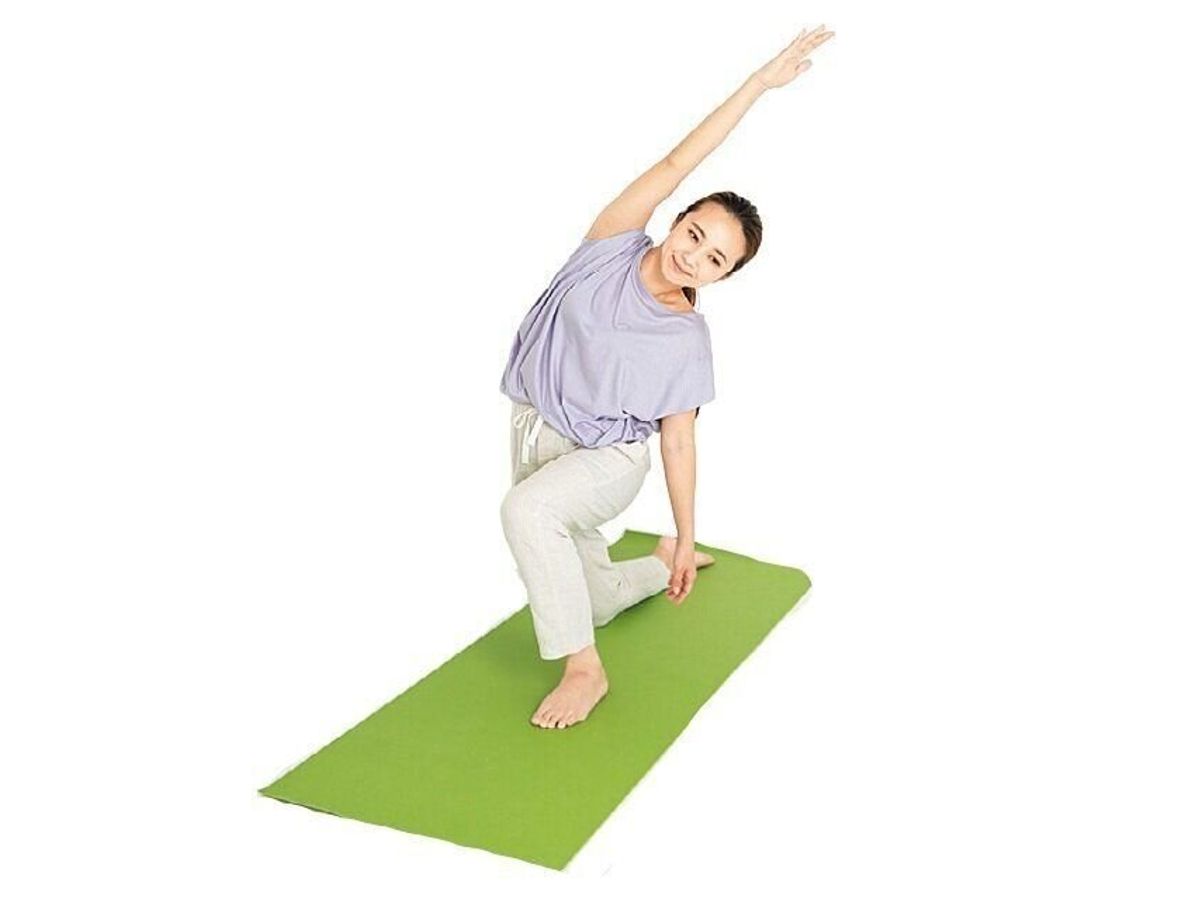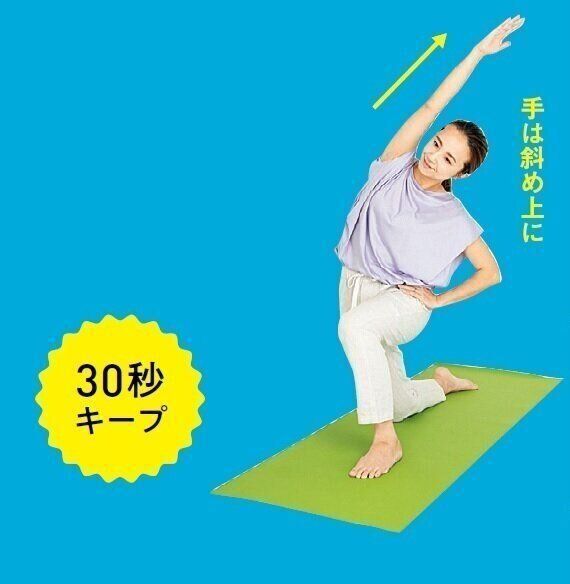 右手を上げた状態で上半身を左に倒して、30秒キープ。