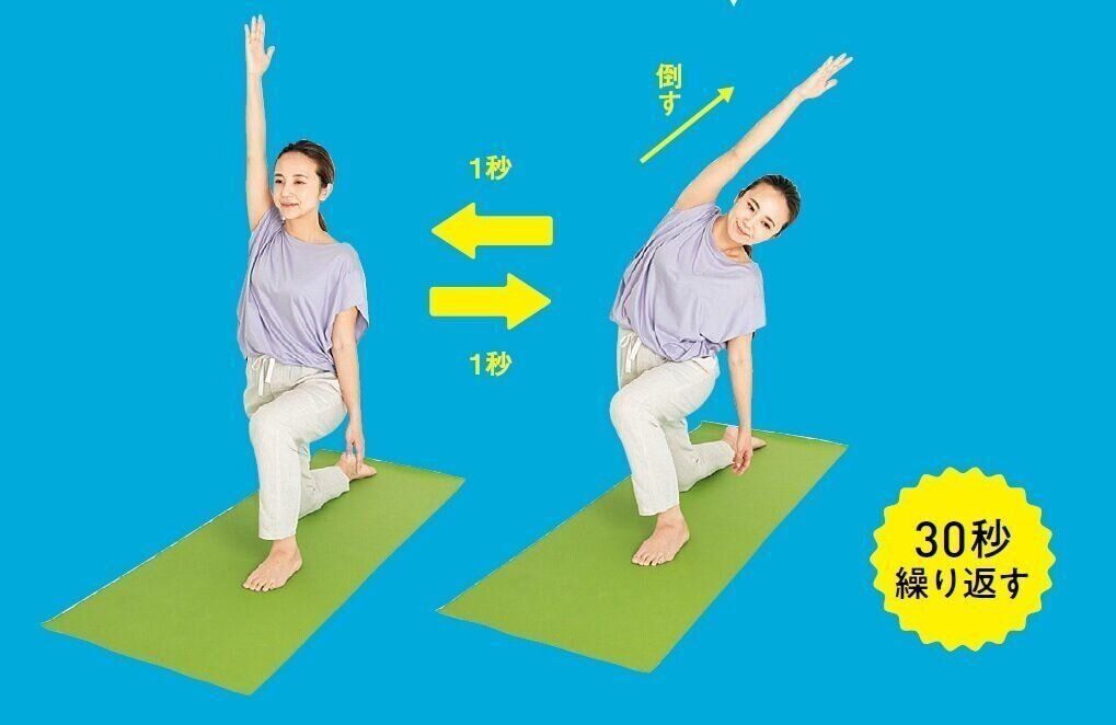 左手を上に伸ばしたまま、元の姿勢に戻る→上半身を倒す→戻すを1秒ごと交互に30秒間繰り返す。