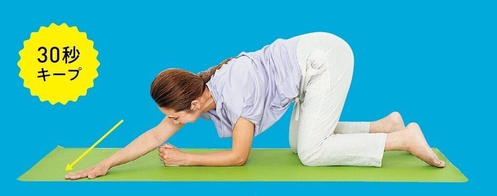 両ひじをついて四つんばいになり、左ひじをついて、右手を左手の延長線上、できるだけ遠くに伸ばして30秒キープ。