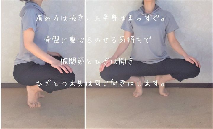 剣道や相撲で取り入れられている「蹲踞(そんきょ)の姿勢」は、ひざ周りやおしり周りの筋肉をきたえ、体幹を整えるのに効果的なポーズです。垂れて大きく見えるおしりやポッコリ下腹部を引き締めるだけでなく、骨盤底筋もきたえられるでしょう。