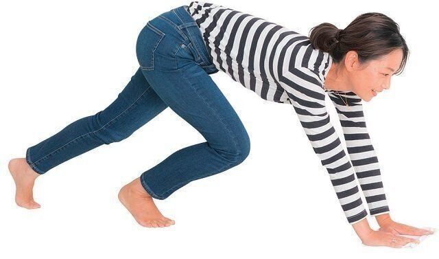 四つん這いになり、片足ずつ後ろに伸ばして持ち上げるエクササイズです。年齢を重ねるとおしりの筋肉をきたえすぎるより、太ももを程よくほぐすほうがよいでしょう。