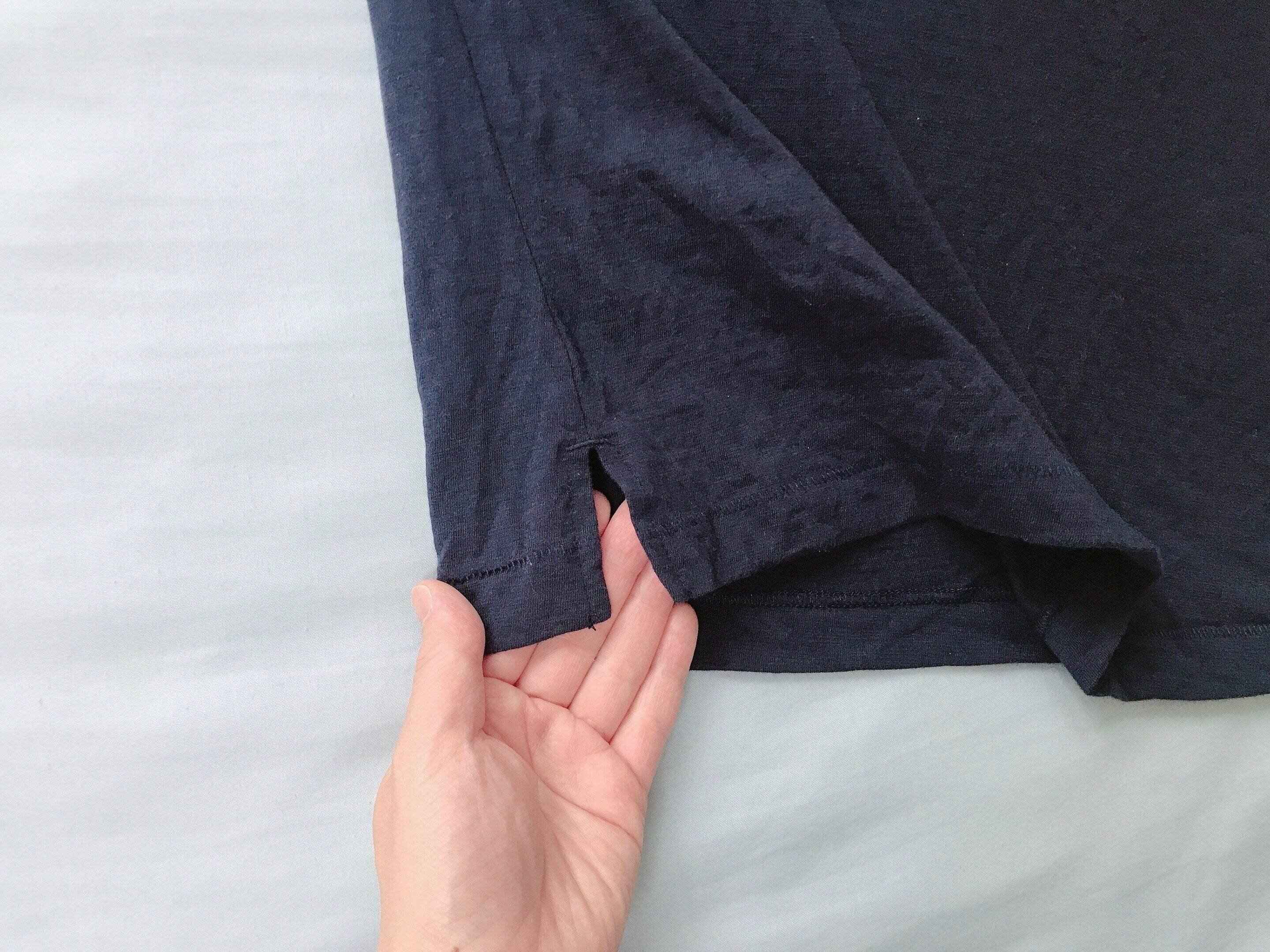 ちょっとしたデザインですが、パンツの上に出して着た時にスッキリ見えます。