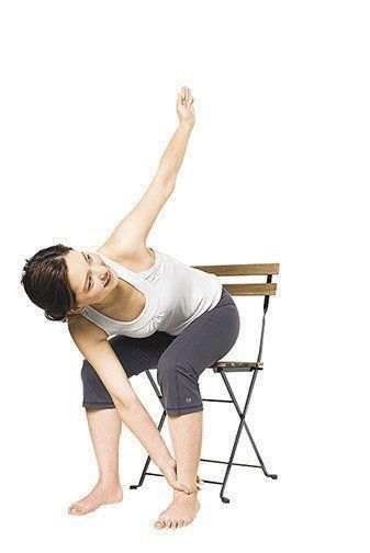1)椅子や便座に浅く腰かけ、肩幅に足を開きます。右手で左足首をタッチし、同時に左手はできるだけ上に高く引き上げ、そのまま10秒キープ