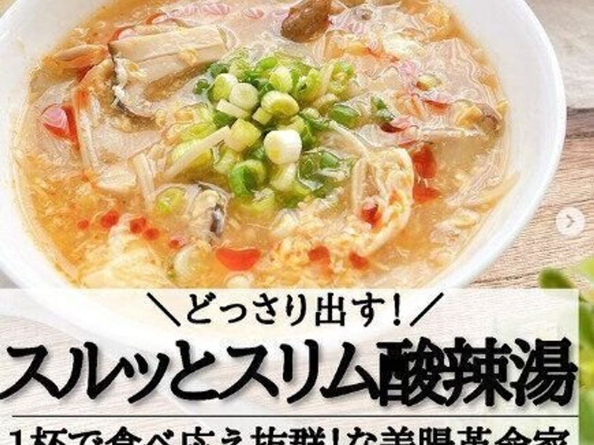 こちらはその名も「スルッとスリム酸辣湯」。お通じをよくすると言われるきのことごぼうがたっぷり。つくり方は、鍋に好きなキノコ類とささがきにしたごぼうを入れて、水、鶏がらスープの素、しょうゆ、片栗粉を入れてじっくりと煮立たせます。卵を溶いていれたら強火で加熱して火をとめます。お酢、塩コショウで味をととのえ、最後にラー油をかけてできあがり!冬のダイエットにはこういう温かいスープがうれしいですよね。