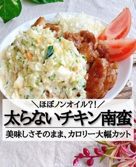 その名も「太らないチキン南蛮」。ダイエット中にチキン南蛮が食べられるなんてうれしいですよね。揚げずにつくるのがポイント。フライパンで鶏もも肉の皮目をパリッと焼いたあと、じっくりと火をとおし、しょうゆと「カンタン酢」で味つけをし照りをだします。タルタルソースは、ゆで卵、きゅうり、玉ねぎ、マヨネーズ、ヨーグルト、レモン汁、塩コショウで。野菜たっぷりのタルタルソースもおいしそうです!