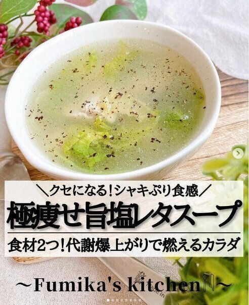 その名も「極やせ旨塩レタススープ」。食材はたった2つ、ささみとレタスです。つくり方は、ささみの筋を取り、ひと口大にそぎ切りします。鍋に水、鶏ガラスープの素、白だし、塩、おろしにんにく、おろししょうがを入れて煮立たせます。ささみを入れて色が変わったらレタスを入れてひと煮たち。ごま油をいれブラックペッパーをかけて完成です。ささみでタンパク質を補給、レタスで食物繊維をプラスです!
