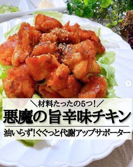 今日はガッツリ食べたい!それならダイエット中におすすめの調味料、コチュジャンを使ったこちらの「悪魔の旨辛味チキン」です。つくり方は、鶏もも肉をひと口大に切り、コチュジャン、鶏がらスープの素、おろしにんにく、おろししょうがで下味をつけ、冷蔵庫で30分からひと晩寝かせます。フライパンで(油はひかず)焼いたらできあがり。コチュジャンたっぷりで脂肪を燃やして。旨辛タレでお腹も大満足ですね。