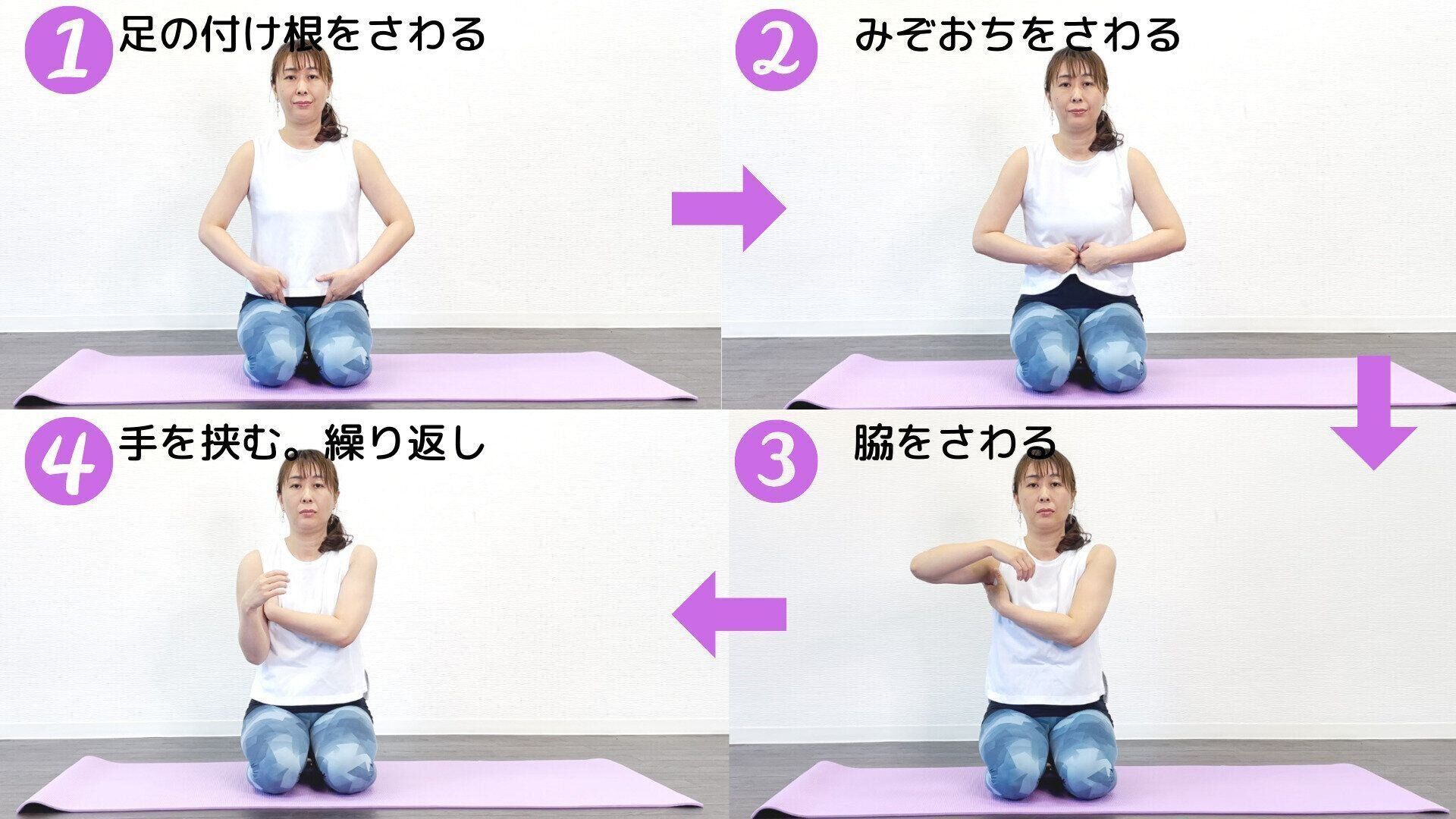 この準備を行うことで、体幹のインナーマッスルが使いやすくなります。ポーズ前の準備として行いましょう。