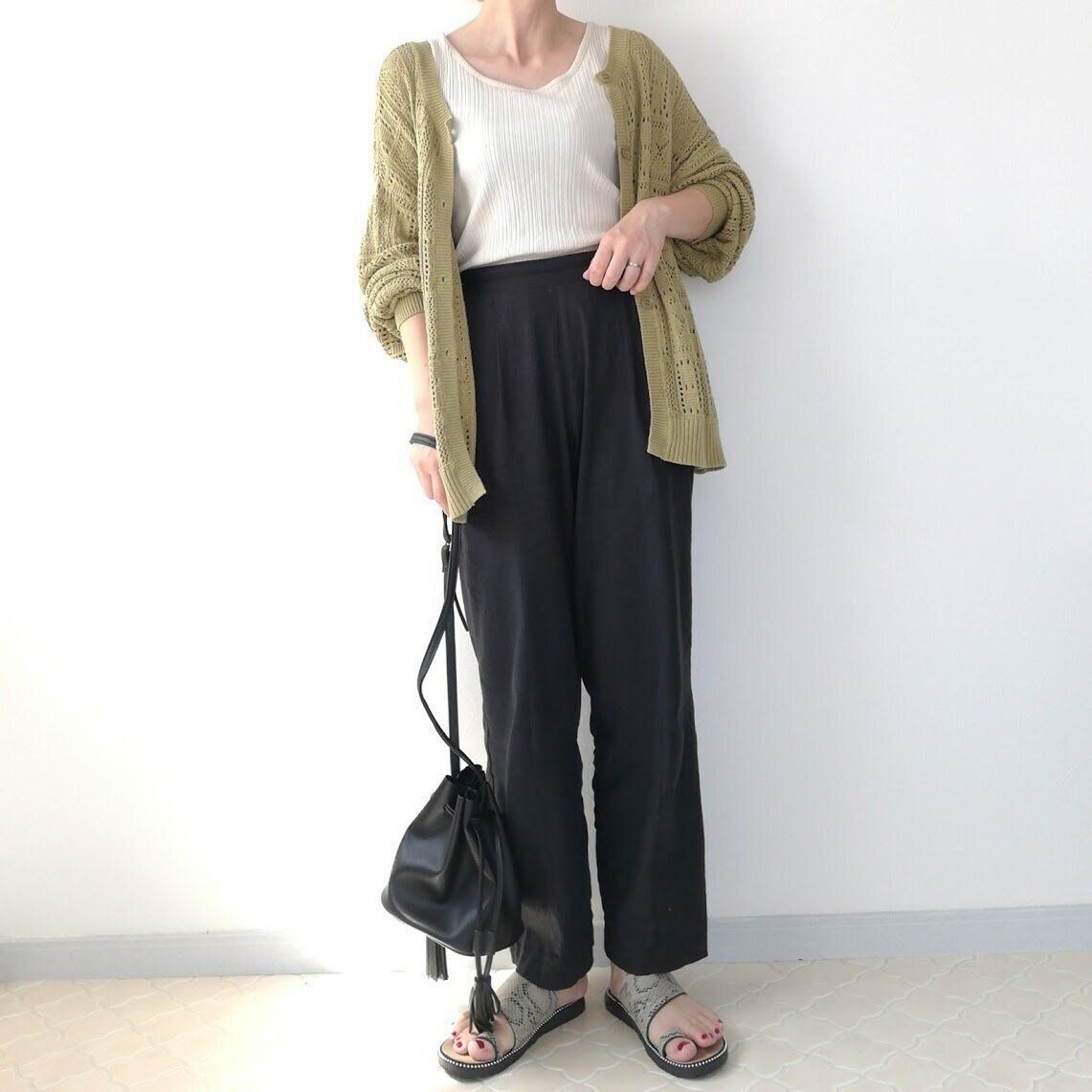 ノースリーブ×パンツにさらりと羽織って。透かし編みなので暑苦しくないところも◎袖をたくし上げて着ると、こなれた着こなしになりますよ。