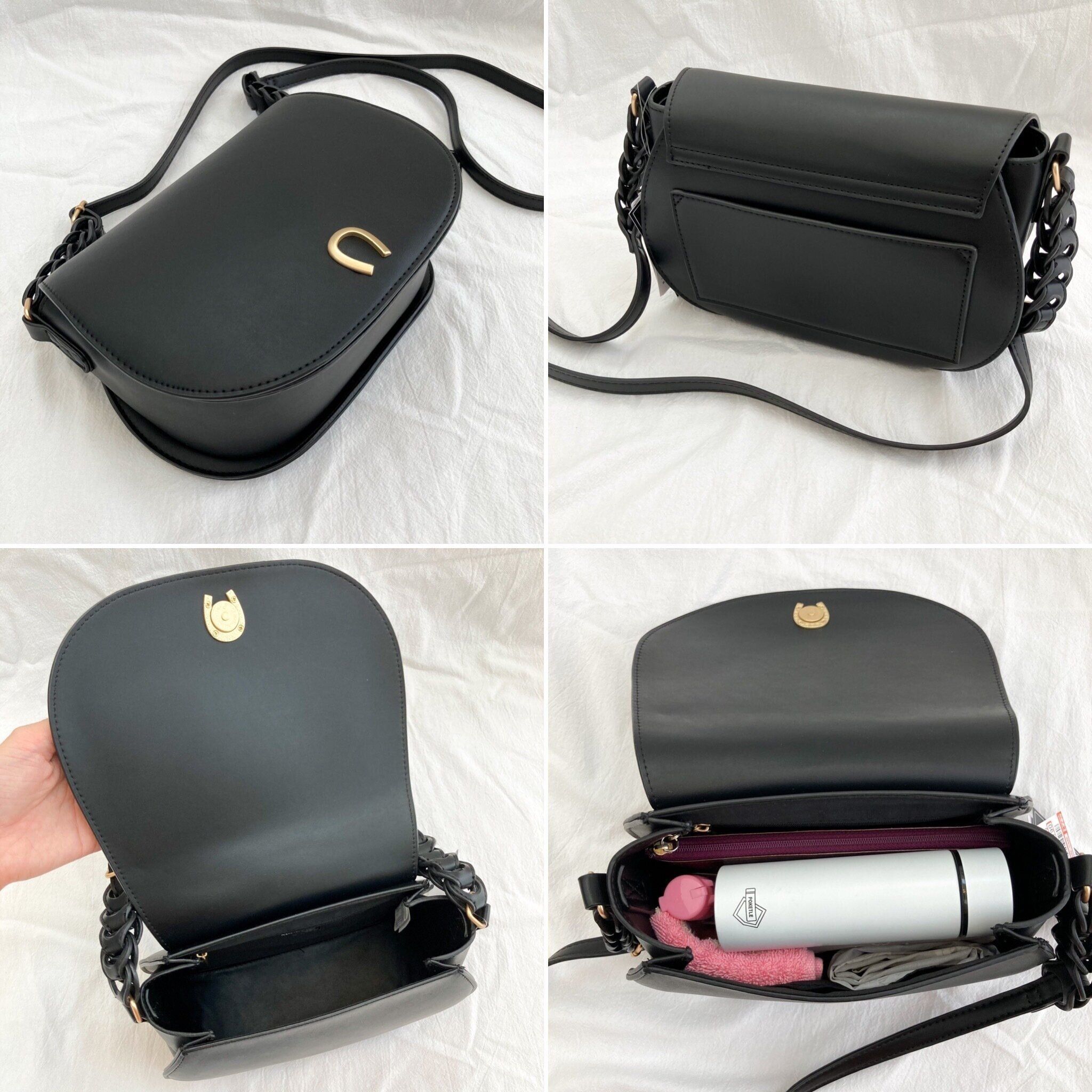 マットな質感の滑らかな合皮素材がまるで本革のよう。素材感がとにかくびっくりするぐらい高見えします!フラップ式で、正面には艶消しゴールドの馬蹄型プレートが付いていて、オシャレなアクセントに。