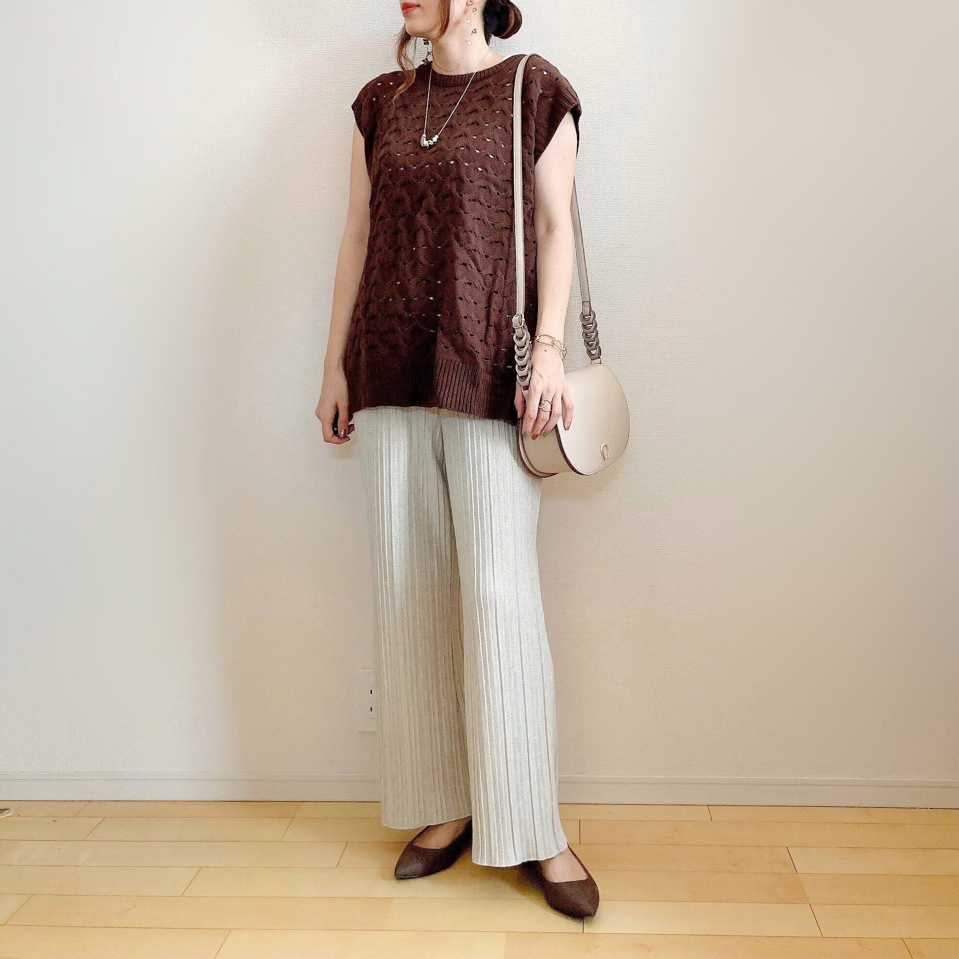 ブラウンのニットベスト・アイボリーのプリーツニットパンツと合わせたラテカラーコーデ。ベージュに近い優しいアイボリーがとても上品で、今人気の淡色コーデとの相性もバッチリです。