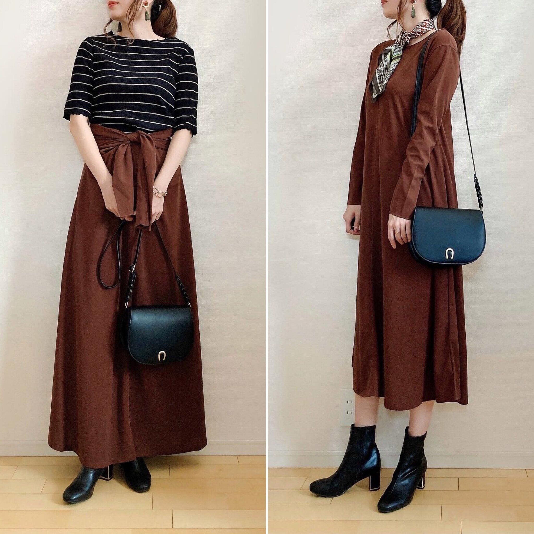 こっくりしたブラウンの2wayワンピースと合わせて秋の大人綺麗めコーデ。3色比べてみて個人的に一番高見えすると感じたのはブラックです。上質で小技の効いたデザインがコーデをワンランクアップさせてくれます。ブラックは何にでも合わせやすく万能なのでオススメです。