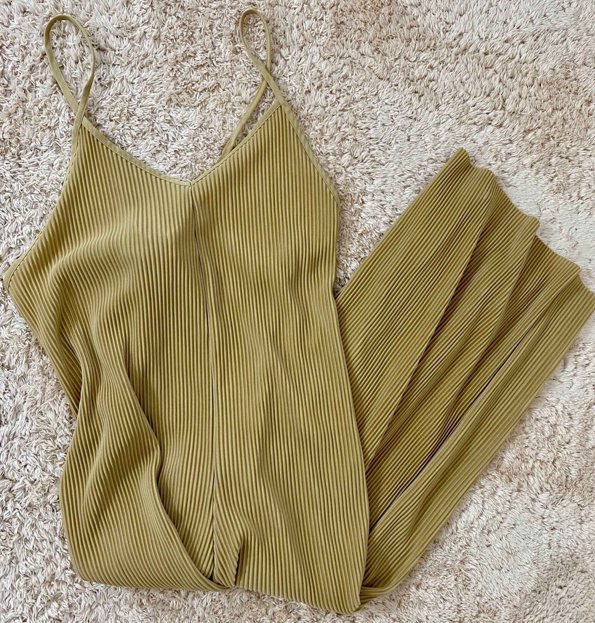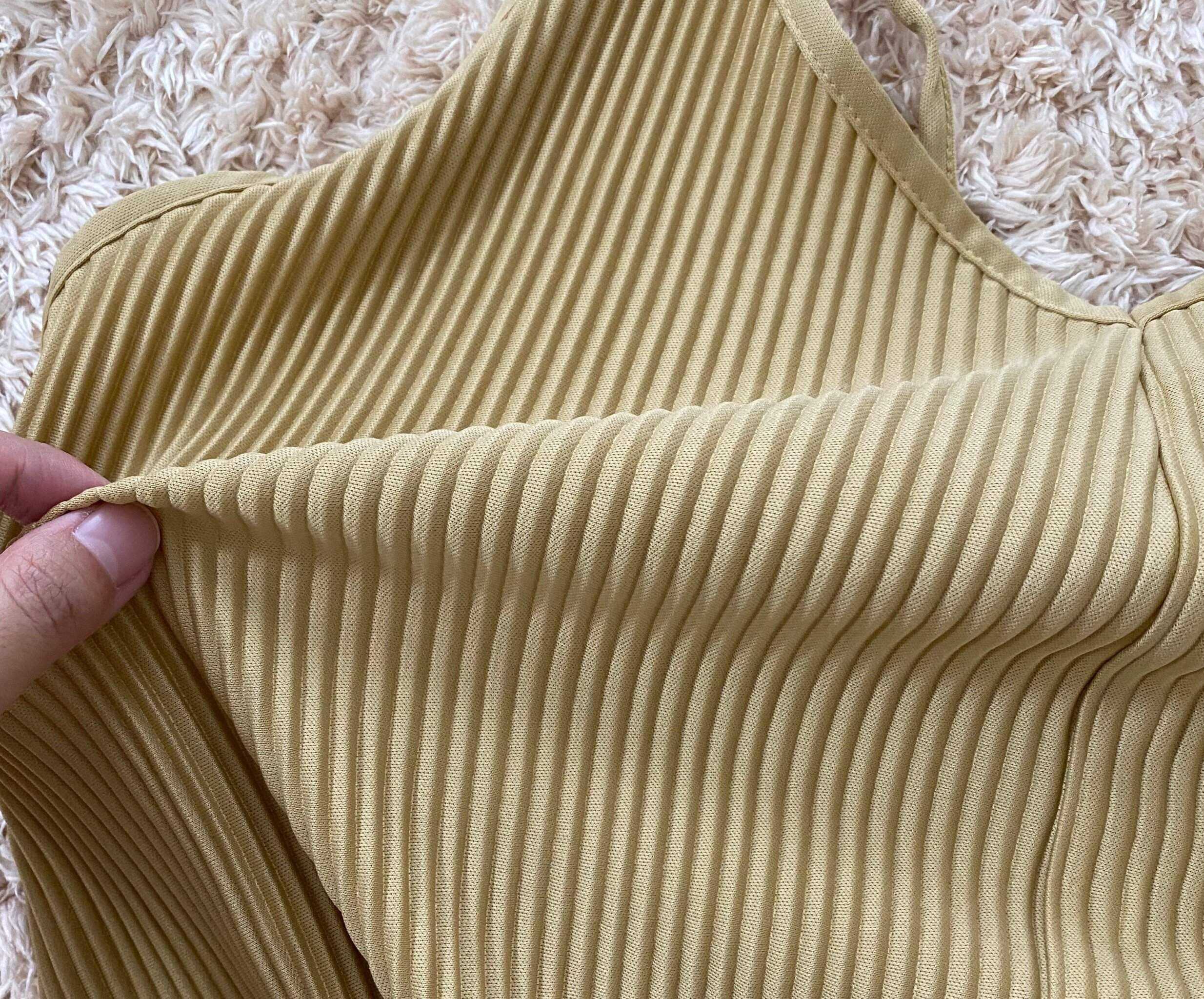 素材のアップがこちら。横伸びするプリーツ加工なので、縦のラインが強調されて細見えです。