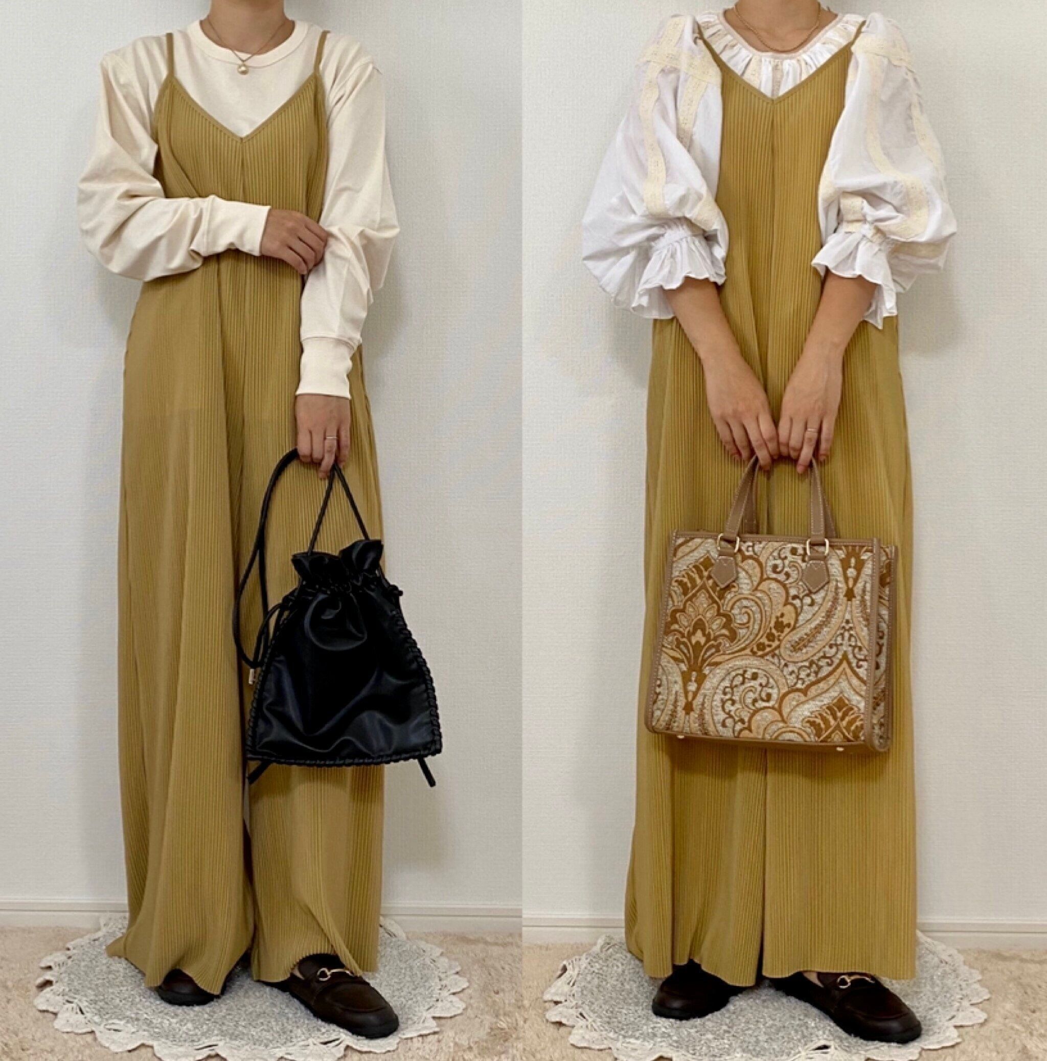 シンプルにロンTはもちろん、オールインワンがストンと落ちるシルエットなのでボリューム袖ブラウスとも相性抜群。