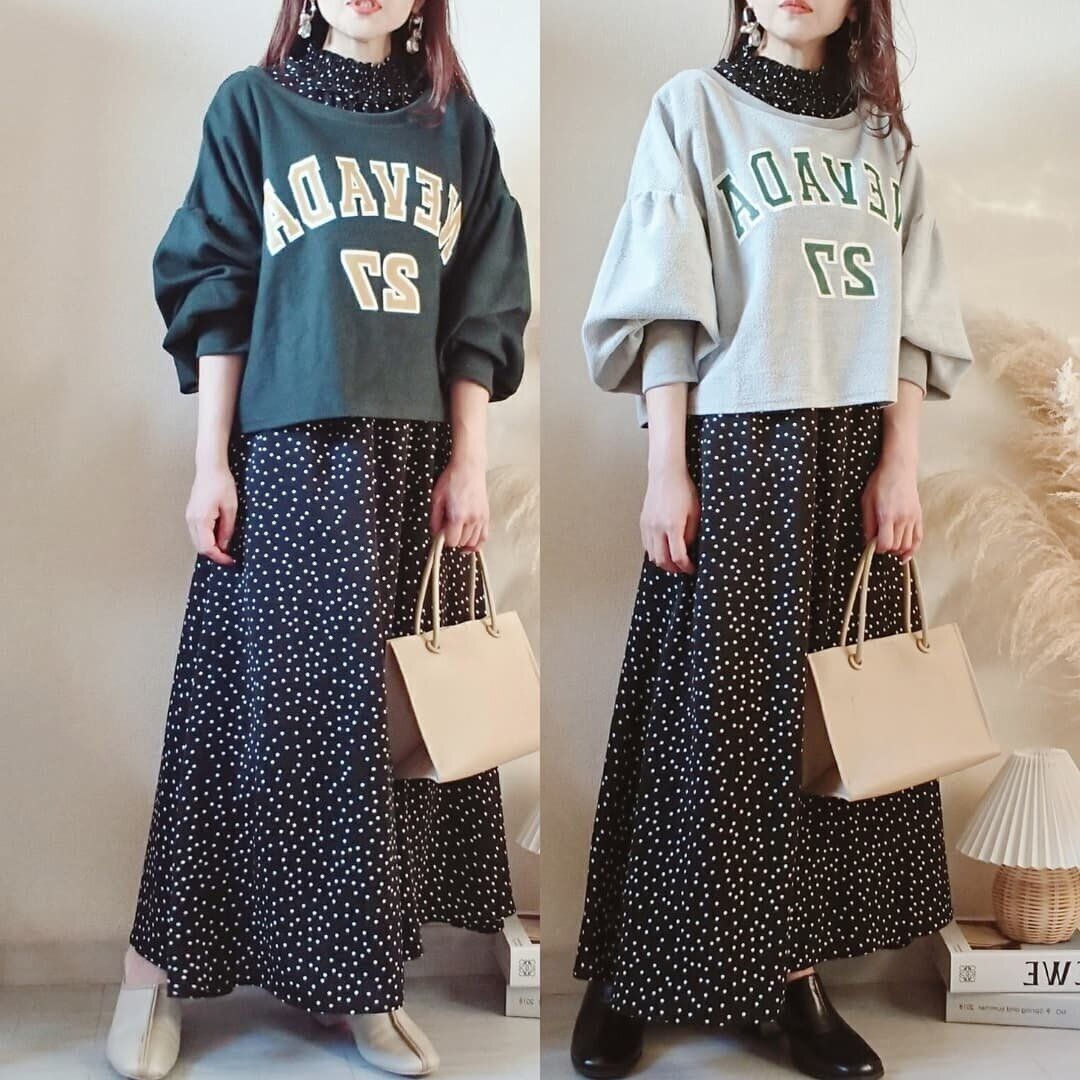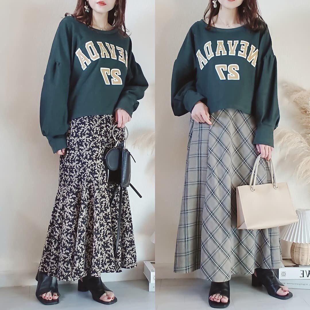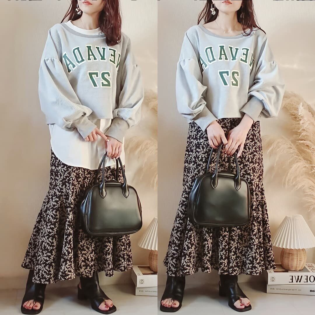 ロゴスウェットを大人可愛く見せるアイテムとして柄物のスカートでコーデしてみました。
