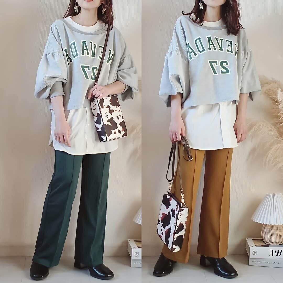 レイヤードでパンツコーデ。グレーにカラーパンツでコーデですが、