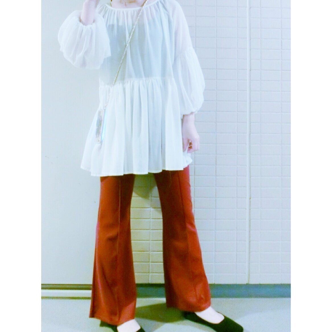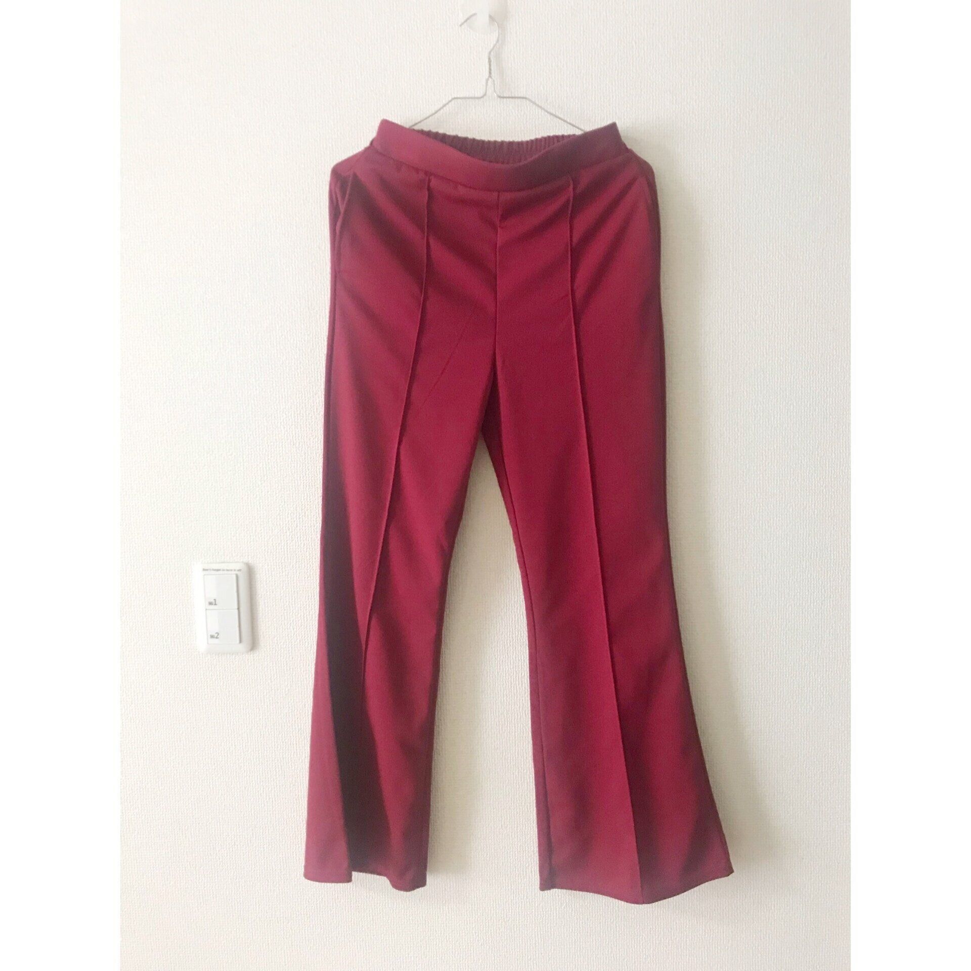 フレアパンツはストレートパンツよりも足長効果が期待できるうえに、このパンツはセンターステッチがされているので足が細く見えるのもお気に入りのポイントの一つ。