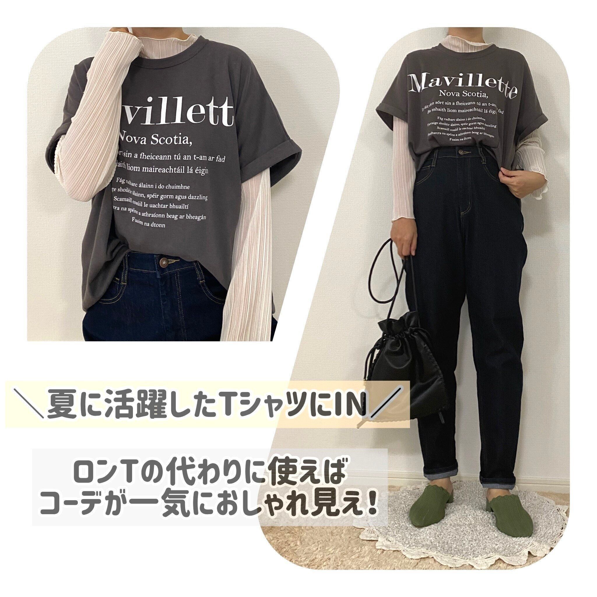 TシャツにロンTを重ねる定番スタイルのインナーをこちらのシアートップスにチェンジ!