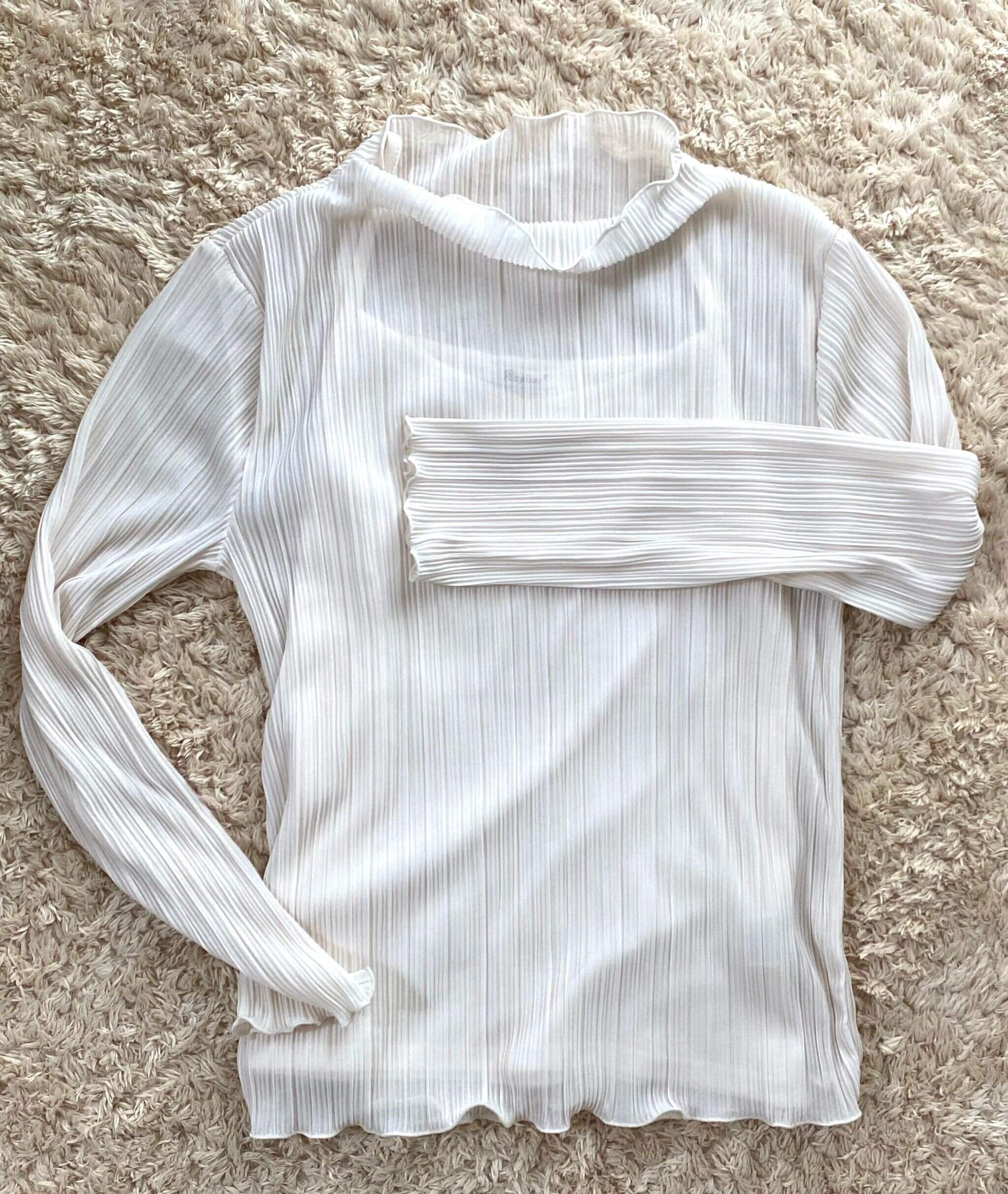 このお値段でインナーのキャミソールがついてくることに驚きです。透け感のあるシアー素材にプリーツ加工でストレッチも効いており、着脱楽ちんです!