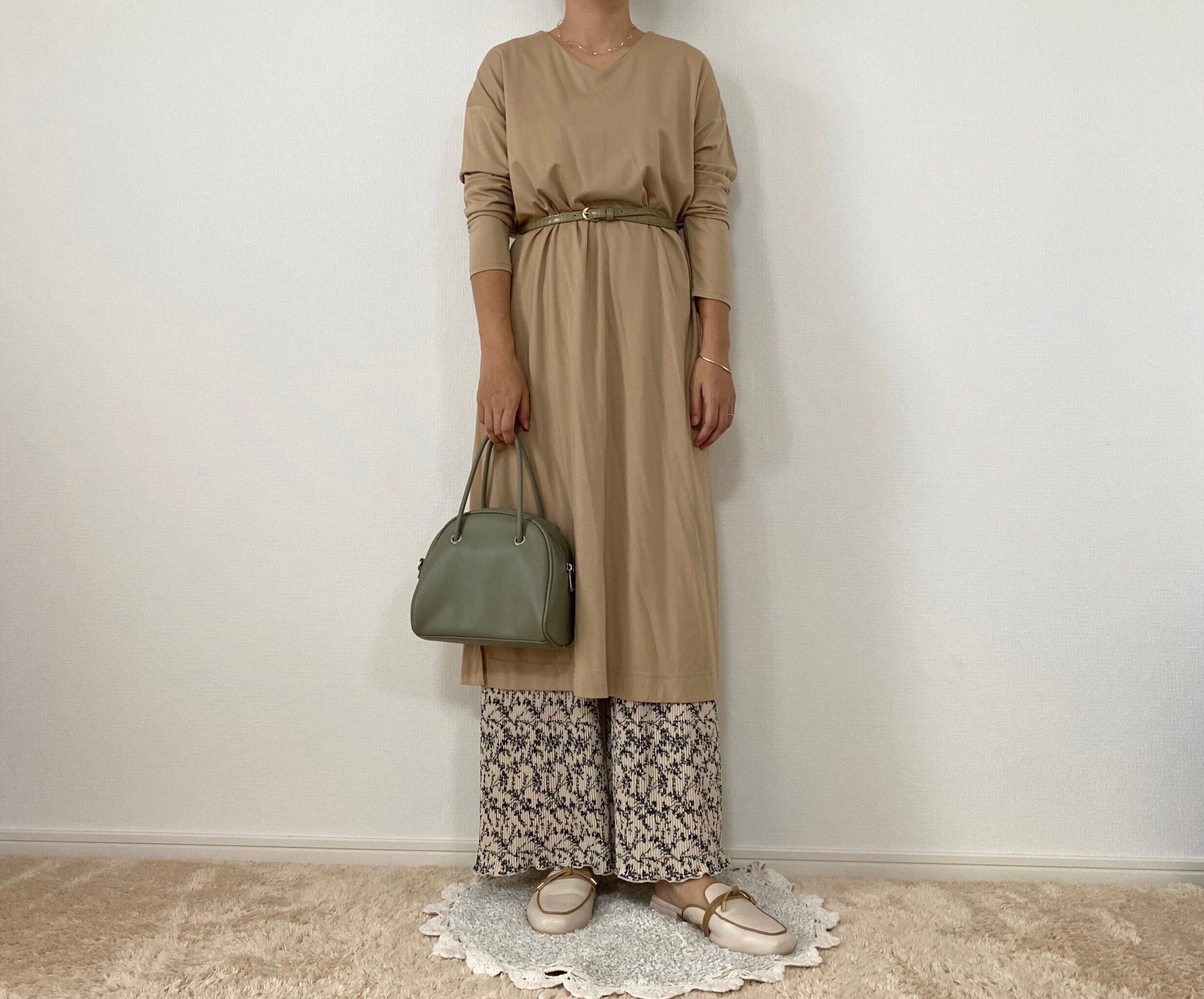 カラーバリエーションはこのくすみグリーンのほかにボルドーのような濃茶や、使いやすそうな濃ベージュと薄ベージュも並んでいました。私はこのくすみグリーンに一目惚れでした。