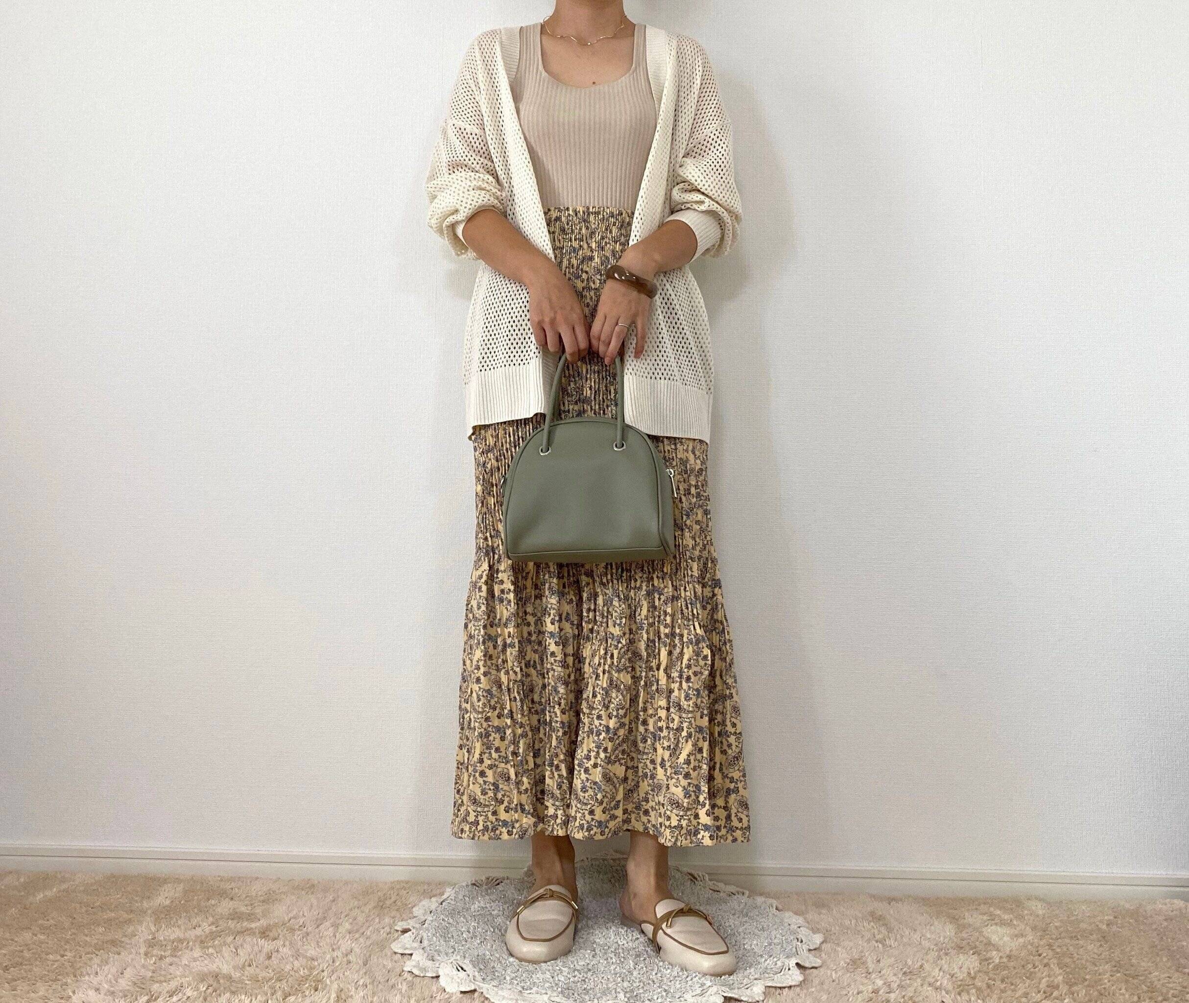 こちらも全体はベージュベースのコーデで同じですが、黄色の花柄スカートと合わせてみました。