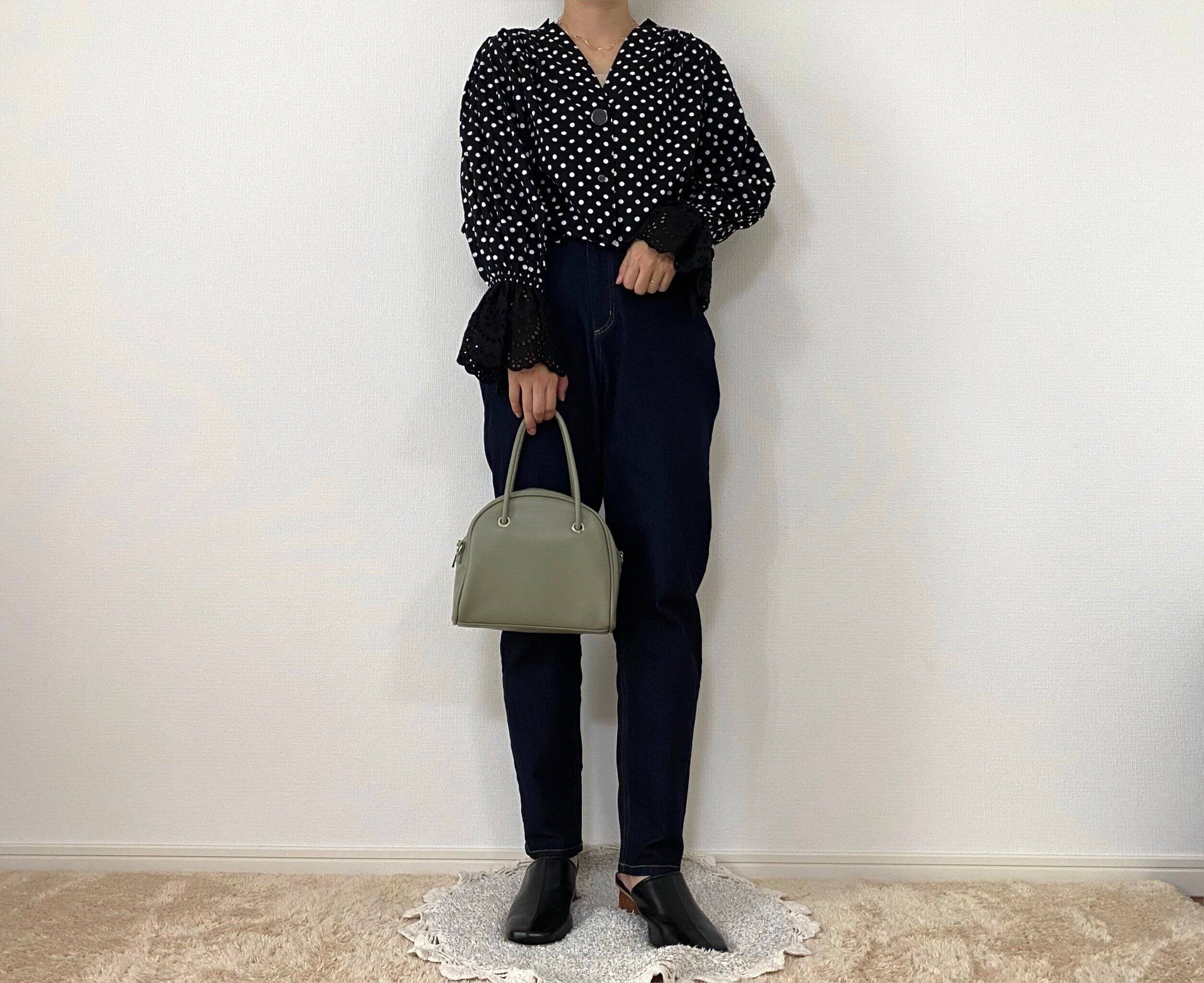 寒くなってくると暗いカラーのお洋服がどうしても増えてきますよね。こちらはブラックコーデの差し色としてくすみグリーンを加えてみました。